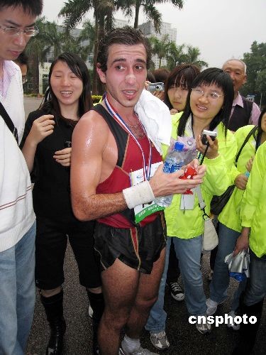“九洲杯”珠海首屆半程馬拉松邀請賽于二十二日早上八點鳴槍起跑,該項賽事吸引了境內(nèi)外兩千名長跑愛好者參加。經(jīng)過一番角逐,本次半程馬拉松賽的男子總冠軍由亞洲半程馬拉松紀錄保持者、香港選手史提芬奴贏得,女子總冠軍則由十六歲的中國籍女孩楊麗文奪得。圖為史提芬奴在結(jié)束比賽后接受記者的訪問。中新社發(fā) 鄧媛雯 攝