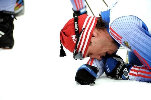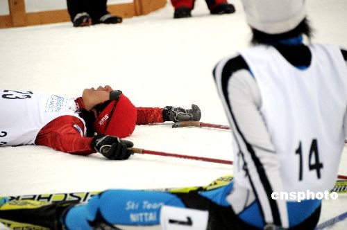 2月23日,大運(yùn)會(huì)北歐兩項(xiàng)之10KM越野滑雪比賽結(jié)束后,參賽選手疲憊得紛紛倒地休息。中新社發(fā) 鄭宇鈞 攝