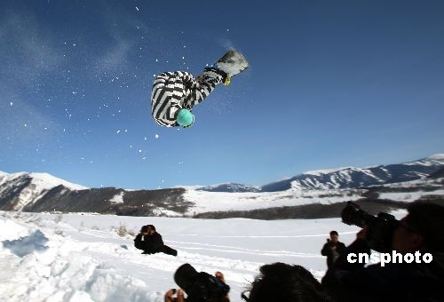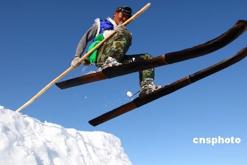 3月6日,首屆新疆喀納斯“雪上飛”杯單板野雪超級大回轉(zhuǎn)邀請賽,在新疆著名的旅游景點——喀納斯禾木村舉行,來自新疆各地7家滑雪場和單板俱樂部的37名選手參加比賽,演繹高山野雪的驚險與刺激。比賽間隙,專業(yè)運動員進行的單板跳臺特技表演與當?shù)啬撩襁M行的阿勒泰古老毛滑雪板表演令參賽選手大飽眼福。中新社發(fā) 劉新 攝