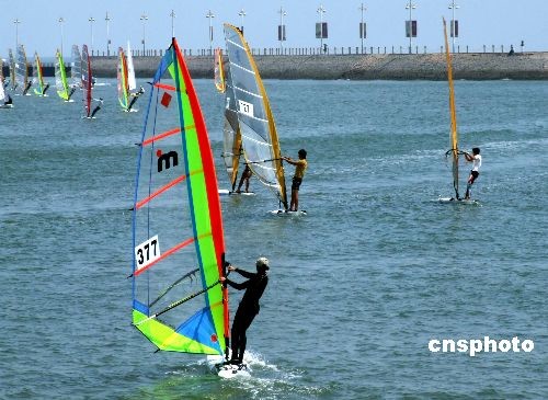 5月7日上午10時,中國第十一屆全國運動會帆板預賽在山東省日照市萬平口海域拉開戰(zhàn)幕,來自全國16個省、市及解放軍代表隊的200多名運動員、教練員、領隊、裁判員參加帆板預賽的比賽。此次預賽將產生今年10月份舉行的決賽的30個名額。中新社發(fā) 林德強 攝