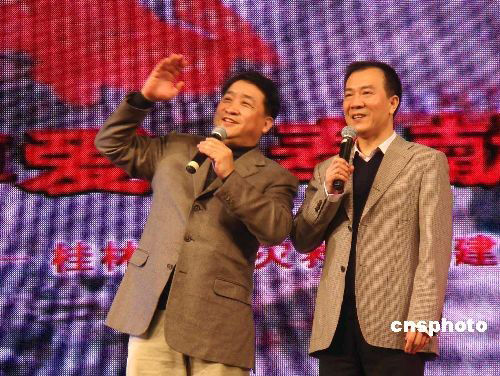 2月25日晚,中國(guó)著名相聲表演藝術(shù)家姜昆(左)、戴志誠(chéng)(右)代表中國(guó)文聯(lián)、中國(guó)紅十字會(huì)慰問(wèn)團(tuán)為桂林賑災(zāi)晚會(huì)表演相聲《樂(lè)在其外》。當(dāng)晚,馮鞏、牛群、鞠萍、劉蘭芳等明星也參加了此次賑災(zāi)晚會(huì)。中新社發(fā) 歐惠蘭 攝