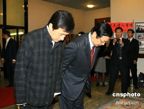 成龍?jiān)谥袊?guó)駐英使館吊唁四川地震遇難者