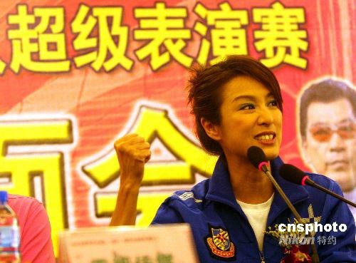 7月5日,香港明星足球隊代表米雪、成奎安、羅家英和泰迪羅賓在重慶參加“2008中國·重慶香港明星足球隊超級表演賽新聞媒體見面會”,為表演賽宣傳造勢。圖為香港明星足球隊啦啦隊隊長米雪回答記者提問。中新社發(fā) 郭晉嘉 攝