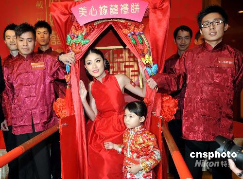 九月三日,某商家特邀即將于十月出嫁的香港歌星陳慧琳穿著裙褂,坐著八人大紅花轎出席新聞發(fā)布會,為活動宣傳造勢。中新社發(fā) 鄧慶樂 攝