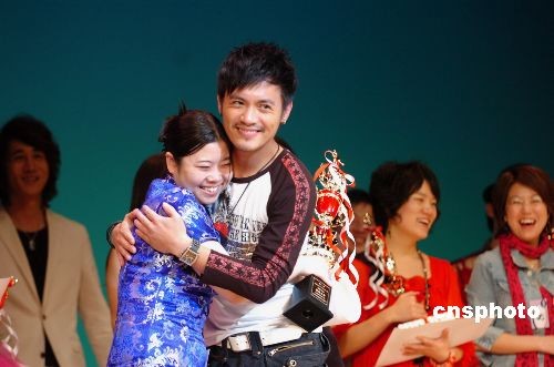 11月17日晚,第11屆日中卡拉OK大賽決賽在日本東京練馬文化中心舉行。這項連續(xù)舉辦了十一年的中國人唱日本歌、日本人唱中國歌的民間歌賽已漸成一知名品牌受到兩國文化愛好者的歡迎。因主演了創(chuàng)下臺灣票房奇跡的影片《海角七號》而炙手可熱的臺灣當(dāng)紅小生范逸臣此次作為特邀嘉賓出席大賽,不僅獻(xiàn)唱了三首代表作更親為獲得最優(yōu)秀獎的選手頒獎。圖為范逸臣為獲獎選手頒獎后與其擁抱祝賀。中新社發(fā) 朱沿華 攝