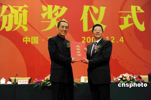 十二月四日,中共廣西壯族自治區(qū)委員會、廣西壯族自治區(qū)人民政府授予著名導演張藝謀“廣西杰出貢獻獎”,獎勵一百萬元人民幣。中新社發(fā) 蔣雪林 攝