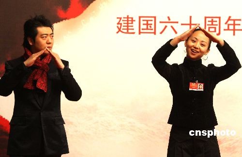 3月8日,建國60周年獻(xiàn)禮歌曲《國家》在北京舉行MV開機儀式,鋼琴演奏家郎朗、《千手觀音》表演者邰麗華出席儀式。圖為邰麗華(右)用手語演繹歌詞,并現(xiàn)場教授郎朗。中新社發(fā) 張宇 攝