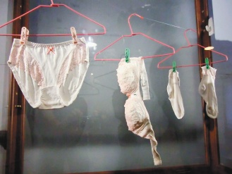 本周一上場、將展到年底的最新一批工藝作品中,劉武創(chuàng)作的“晾”,展示柜高掛女性內(nèi)衣褲、襪子,連日來引爆話題。昨日上午還有大批陸客圍觀,不少人竊竊私語說:“這真的是女兵內(nèi)衣褲嗎?”