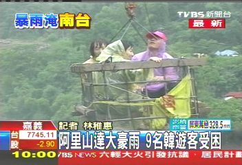 中新網7月28日電 據臺灣TVBS報道,西南氣流造成阿里山雨量達大豪雨標準,部分村落聯(lián)絡便道被沖毀,有9名韓籍游客,受困在山美村達娜伊谷,當地消防隊打算以流籠接駁方式協(xié)助。