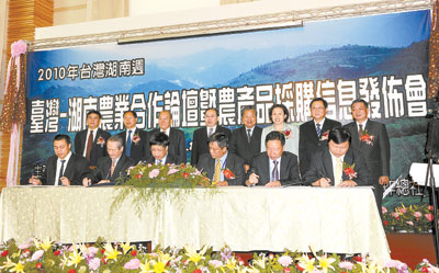 “2010年臺灣湖南周”期間,湖南代表團成員在簽約、采購中奔忙。湘臺雙方共簽約投資合作項目41個,總投資16.17億美元;對臺采購協(xié)議41個,采購金額1.32億美元。
