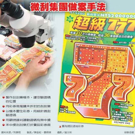 警方指出,翁子庸等人發(fā)現(xiàn)每張刮刮樂(lè)彩券的刮彩區(qū)內(nèi)都有驗(yàn)證碼,例如中獎(jiǎng)2000元的驗(yàn)證碼是“T”、“T”、“H”,200元是“T”、“W”、“O”,三個(gè)英文字母看似隨機(jī)落點(diǎn)刮彩區(qū)內(nèi),實(shí)際上,落點(diǎn)都由計(jì)算機(jī)選擇集中在固定區(qū)塊;翁嫌取得彩券后,把彩券放在顯微鏡下,再使用自制細(xì)針點(diǎn)刮彩券刮刮膜5、6點(diǎn),透過(guò)顯微鏡辨識(shí)驗(yàn)證碼是否中獎(jiǎng)落點(diǎn)。