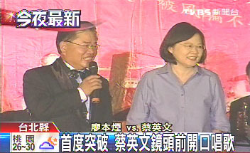 昨晚在永和市樂(lè)華夜市,“立委”廖本煙唱“小城故事”,他好幾次想找機(jī)會(huì)把麥克風(fēng)往蔡英文面前比,但她像看到火把,馬上靠邊閃。不過(guò)電視畫(huà)面顯示,蔡英文也還是首度突破自我,開(kāi)始開(kāi)口唱歌,看她嘴型,咬字還蠻完整。