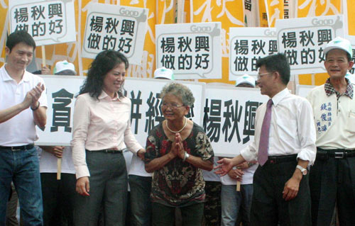 楊秋興83歲慈母楊王春還親自為楊披掛彩帶,她感性地表示,他把兒子交給大家,希望在眾人栽培下,能當(dāng)選市長為民服務(wù)。