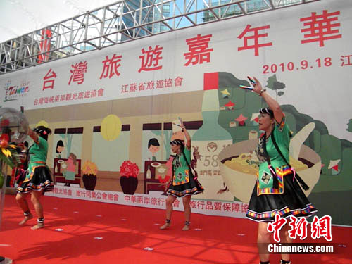 中新網(wǎng)南京9月18日電 (記者 王國安)臺灣少數(shù)民族的激情歌舞,拉開了臺灣海峽兩岸觀光旅游協(xié)會18日在南京舉行的戶外嘉年華活動序幕,以此方式向江蘇民眾“面對面”推介臺灣游。