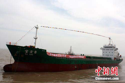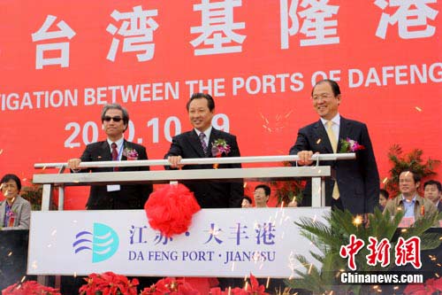 中新網(wǎng)鹽城10月19日電 (記者 于從文)19日上午11時18分,隨著中共鹽城市委書記趙鵬一聲宣布,鹽城地方政府官員與臺灣基隆港物流協(xié)會會長共同啟動拉桿,一艘“寶宏8號”貨輪緩緩離岸駛向臺灣基隆港,江蘇大豐港與臺灣基隆港實現(xiàn)首次直航。