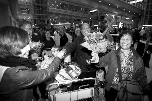昨晚,首批被困北京游客抵京。20時(shí)剛過(guò),游客紛紛走下飛機(jī),多為白發(fā)老人。在接機(jī)口,神舟國(guó)旅工作人員將鮮花送到老人手上,老人們表示感謝,“我們命大,感謝大家關(guān)心!