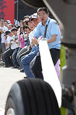 員工組則顯得有備而來(lái),穿著整齊制服,當(dāng)30十名選手還拉不動(dòng)時(shí),遠(yuǎn)航董事長(zhǎng)樂大信和總經(jīng)理陳尚群也加入拔河,直到40人終于拖動(dòng)飛機(jī),多位選手大呼好玩。