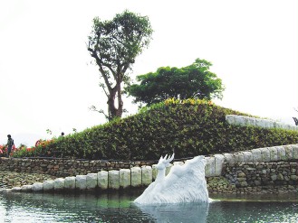 “邵族”人配合工程,協(xié)力規(guī)劃在潭北水域島旁,依“邵族”先人追逐白鹿到水邊的傳奇故事,設(shè)置雕塑白鹿一只,刻意半浮在水中,讓游客聯(lián)想當(dāng)年“邵族”人追隨白鹿神話(huà)故事,希望增添此島的神秘性。