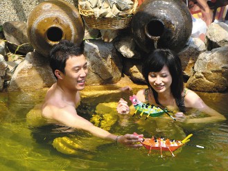 昨天推出的“雄黃酒湯”,在溫泉里加入適量的雄黃酒。據(jù)介紹,雄黃酒含有三硫化砷,不可多喝,但用來泡澡凈身,可以消除疫病,溫泉池畔放了一壺雄黃酒,游客還可以沿襲傳統(tǒng),用手指或毛筆沾酒,在額頭寫一個(gè)“王”字,體驗(yàn)古代人驅(qū)邪的儀式。