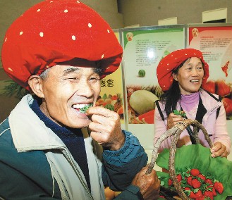 中新網(wǎng)11月30日電 臺(tái)灣農(nóng)業(yè)部門(mén)舉辦的“二00七十大經(jīng)典水果“票選活動(dòng),原本一路領(lǐng)先的臺(tái)南芒果大意失荊州,被苗栗草莓突襲,在投票截止前三小時(shí)翻盤(pán),登上票選王座。苗栗縣長(zhǎng)劉政鴻昨天興奮地戴上“草莓帽”領(lǐng)獎(jiǎng)。