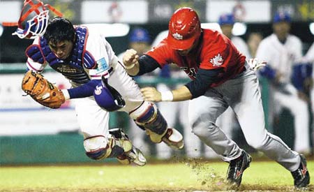 中新網(wǎng)3月11日電 北京奧運(yùn)棒球資格賽昨晚迎來(lái)中國(guó)臺(tái)北隊(duì)與加拿大隊(duì)之戰(zhàn),由于攸關(guān)兩隊(duì)名次,比賽過(guò)程充滿火藥味與緊張氣氛?上е袊(guó)臺(tái)北隊(duì)沒(méi)能守住最后關(guān)卡,九局上被加隊(duì)追平后,延長(zhǎng)賽十局上再失一分,終場(chǎng)以五比六吞下首敗。