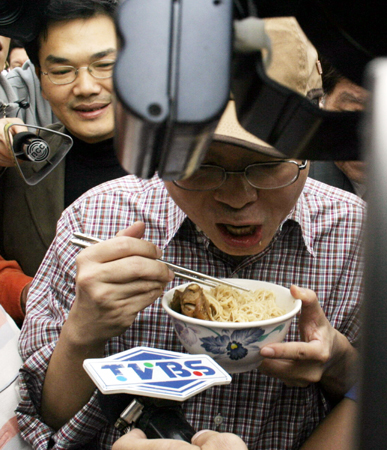 組圖:邱毅減刑出獄 民眾送上豬腳面線去霉氣(2)