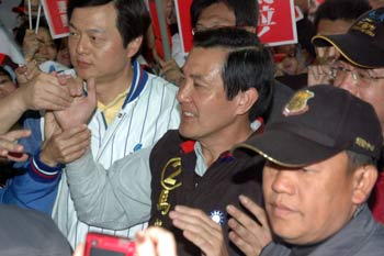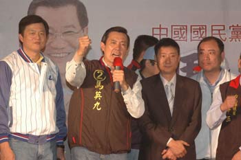 國民黨候選人馬英九(左二)21日在臺北縣掃街前表示,因為選民手中的一票,決定臺灣的未來。一向挺綠的坪林鄉(xiāng)長王潮清(右二)也在馬英九見證下加入國民黨,讓藍營士氣大振。