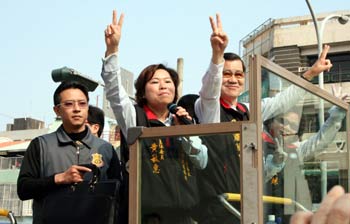 國民黨“副總統(tǒng)”候選人蕭萬長(右一)21日上午回故鄉(xiāng)嘉義市進行車隊掃街拜票,呼吁鄉(xiāng)親要“家己人要挺嘉義人”,讓馬蕭過關(guān)。