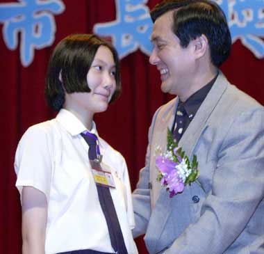 2001年6月2日,也就是7年前馬元中在龍山中學(xué)的畢業(yè)典禮,領(lǐng)的是市長(zhǎng)獎(jiǎng),巧的是頒獎(jiǎng)人就是爸爸馬英九,上臺(tái)時(shí)馬元中先喊了聲爸爸,活潑又顯得有些尷尬,感性的馬英九要女兒親一下,被小女兒連續(xù)拒絕2次,完全不給爸爸面子。