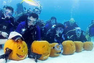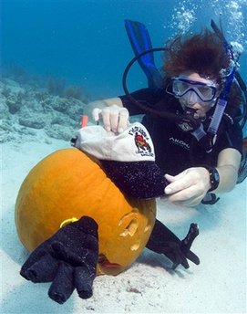 與此同時,美國佛羅里達州26日在海底舉辦了一場別開生面的南瓜雕刻大賽,吸引很多人參加,營造節(jié)日氣氛。