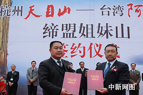 中新網(wǎng)杭州2月24日電(記者 龔讀法 實習生 姜越潮)即杭州靈隱寺與臺灣中臺禪寺結盟之后,杭州天目山與臺灣阿里山結為姊妹山。2009年2月24日上午,在浙江省杭州市天目山山腳下,天目山與阿里山的代表舉行了“杭州天目山——臺灣阿里山締盟姐妹山”合約簽字儀式。并互贈禮物。