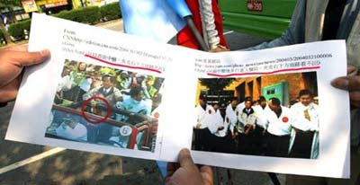 國親聯(lián)盟臺中一位支持者在CNN及蕃薯網(wǎng)站上,下載圖片比對阿扁遭槍擊始末圖片,提出阿扁中槍時夾克有血跡,但進入醫(yī)院前卻沒有,質(zhì)疑槍擊作假。