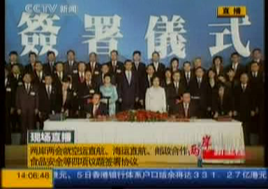 中新網(wǎng)臺北11月4日電 據(jù)本網(wǎng)記者從現(xiàn)場發(fā)回的消息:大陸海協(xié)會會長陳云林與臺灣;鶗麻L江丙坤今天下午14時許在臺北就兩岸海運、空運、郵政、食品安全等議題簽署四項協(xié)議。