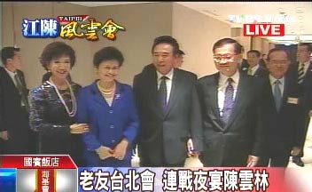 中新網(wǎng)11月4日電 據(jù)臺(tái)灣“今日新聞”報(bào)道,海協(xié)會(huì)會(huì)長(zhǎng)陳云林4日晚上應(yīng)國(guó)民黨榮譽(yù)主席連戰(zhàn)伉儷之邀,與夫人賴曉華赴臺(tái)北國(guó)賓飯店與政界、企業(yè)界共享晚餐,連戰(zhàn)、陳云林在享用餐點(diǎn)前也先后致詞。
