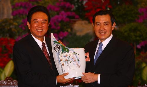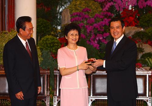 馬英九贈(zèng)送給陳云林的是一個(gè)造型像達(dá)悟族獨(dú)木舟、上面畫著臺(tái)灣蝴蝶蘭,象征一帆風(fēng)順的鶯歌陶作(位于臺(tái)北縣的鶯歌鎮(zhèn)以“陶瓷”著稱,有“臺(tái)灣景德鎮(zhèn)”美譽(yù)。);贈(zèng)送給陳云林夫人賴曉華的是一件琉璃工坊的“大愛豐收”琉璃作品。