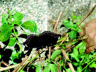 二個(gè)多月前,石進(jìn)宏在伊達(dá)邵一帶找到4個(gè)疑似蝴蝶的蛹,沒想到人工孵化后,居然是伊達(dá)邵已相當(dāng)少見的“琉球紫斑蝶”,孵出3公、1母,最近再繁衍下一代,目前合計(jì)已在園內(nèi)有20只。