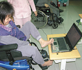十八年前黃美秀讀埔里中學(xué)資源班,老師鼓勵(lì)她學(xué)電腦,六十六歲的祖母每晚陪她去上課,剛開始練習(xí)用腳趾按鍵盤、撥動(dòng)鼠標(biāo),腳上好像綁著大石頭,苦練一星期后,熟練與靈活度已比“正常”同學(xué)還要好。現(xiàn)在她的黃金左腳,大小趾并用,一分鐘可輸入二十個(gè)字。