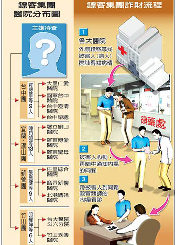 病人若心動(dòng),鏢客就先用電話告知假冒中醫(yī)師在“內(nèi)場(租用的民宅)”等候,再佯裝好心帶路,抵達(dá)內(nèi)場后,由假醫(yī)師把脈看診,因事前早已得知被害人病況,被蒙在鼓里的被害人,很快落入陷阱。