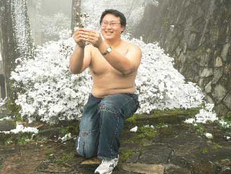 據(jù)臺(tái)灣《聯(lián)合報(bào)》報(bào)道,周漢勛是成大四年級(jí)學(xué)生,和朋友從合歡山一路玩到太平山,看到情侶們雙雙對(duì)對(duì)在雪中散步,十分羨慕;當(dāng)場(chǎng)脫光上衣,跪在雪地上,手拿一把“雪花”,請(qǐng)記者為他傳情,向暗戀已久的學(xué)姐告白,“我喜歡你很久了,只想告訴妳,我喜歡你,我們?cè)谝黄鸢!?/p>