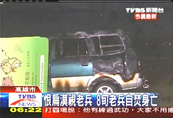 據(jù)臺灣TVBS報道,事發(fā)現(xiàn)場,小客車被燒得只剩支架。疑似用汽油引火自焚的男子,是已經(jīng)高齡80歲的老兵許昭榮。