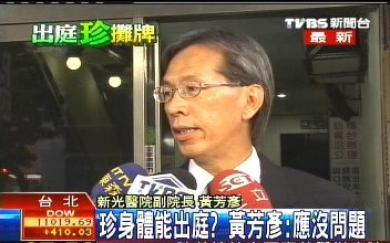 據(jù)臺灣TVBS報道,黃芳彥說:“法院的準備都很好,我想都有萬全的準備,因為我不是她的主治醫(yī)師,所以病情我也不了解,也不便多透露,我是她的家庭醫(yī)生,而她的病需要?漆t(yī)生來照顧,我想法院也會以主治醫(yī)師的意見為意見!