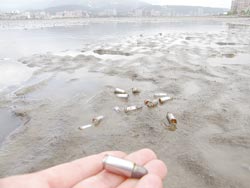 據(jù)臺灣《中國時報》報道,一名陳姓釣客12日中午趁淡水河退潮,前往事發(fā)的沙洲帶釣魚,發(fā)現(xiàn)距離河岸十米的沙洲泥土中出現(xiàn)大量銀色小圓點(diǎn),在陽光折射下更顯刺眼,原以為是釣魚用的鉛球,靠近一看才確認(rèn)是未擊發(fā)的子彈。