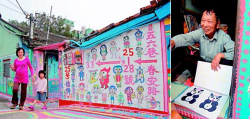 中新網4月7日電 據臺灣《聯(lián)合報》報道,臺中市有處五彩繽紛的彩繪眷村,墻面、地板畫滿人像、動物與色塊,夢境般場景吸引大批博客、攝影玩家,孤寂的眷村頓時熱鬧起來;這些圖畫都出自86歲退伍老兵黃永阜之手,他說,畫圖是排遣無聊,沒想到大家喜歡,讓他越畫越起勁。