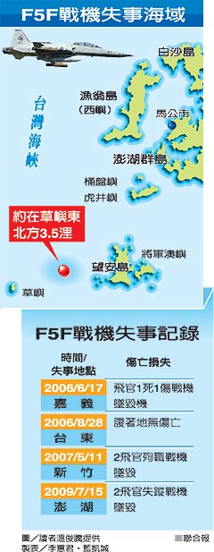 2009年7月15日編號5410的F-5F戰(zhàn)機(jī),在澎湖石礁靶場執(zhí)行空對地炸射訓(xùn)練失事,飛官黃挺瑜中尉和張良元中校失蹤。