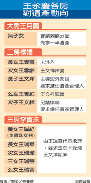 今年五月,王永慶長子王文洋瞞著家族,向美國新澤西法院跨海興訟,要求調(diào)查王永慶海外資產(chǎn),并申請(qǐng)擔(dān)任遺產(chǎn)管理人。這件臺(tái)灣史上金額最高的遺產(chǎn)官司昨天首次開庭,卻又爆出同為二房的王文祥、王雪紅等也要求取得遺產(chǎn)管理人資格,讓官司更復(fù)雜。