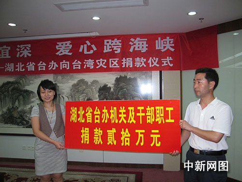 連日來,不斷有湖北社會團體、企業(yè)和民眾致電湖北省臺辦,表示要為災區(qū)捐款、捐物。二十日下午,湖北省臺辦舉行捐款儀式,省臺辦機關(guān)捐出二十萬元人民幣,省臺辦機關(guān)工作人員還現(xiàn)場捐款一點四萬元。二十日,長江三峽工程開發(fā)總公司和武漢鋼鐵集團公司通過臺辦系統(tǒng)和海協(xié)會,分別向臺灣災區(qū)捐款一千萬元和五百萬元。