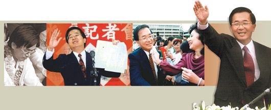 1986年,陳水扁擔任臺北市議員,因蓬萊島事件入獄,但也為他政治生涯加分;擔任“立委”期間,他一再揭發(fā)軍購弊案,被民間團體票選為第一名“立委”;1994年,他當選臺北市長,施政滿意度一度高達76%;2000年,他當選第一次政黨輪替的臺灣地區(qū)領(lǐng)導人;昨天,他卻成為第一位手銬加身的前領(lǐng)導人。