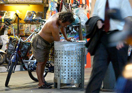中新網(wǎng)10月19日 據(jù)臺灣《中國時報》報道,為救助“新貧一族”,臺灣官方擬修法放寬低收入戶認(rèn)定標(biāo)準(zhǔn),受惠者將達四萬五千人。圖為中年游民光著上身,在鬧區(qū)撿拾垃圾,與穿著西裝筆挺的上班族形成強烈對比。