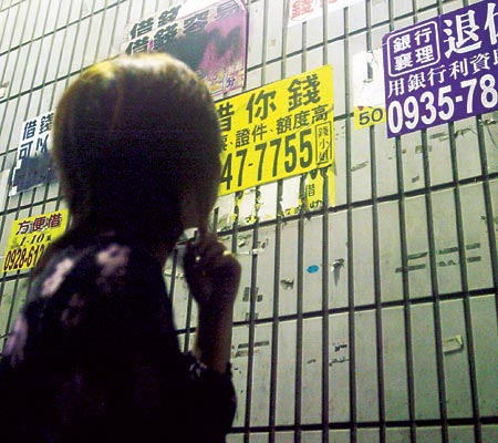 中新網(wǎng)11月1日電 據(jù)臺灣《中國時報》報道,臺當(dāng)局“行政院”十月三十一日通過“融資公司法”草案,被外界視為“地下錢莊”將可順勢合法化,草案內(nèi)容規(guī)定自然人年利率上限為百分之二十,法人的上限為百分之三十。圖為市面街道的借貸放款小廣告。