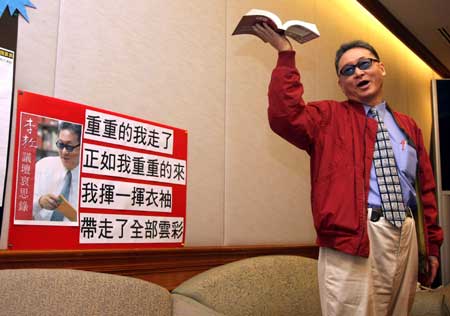 臺灣無黨籍“立委”李敖十一月二十日表示,不參選第七屆“立委”選舉,要把“立委”登記費給兒子做學(xué)費,同時也透過“李敖議壇哀思錄”這本書告訴大家“立法院”是多么黑暗。(圖片來源:“中央社”;謝佳璋/攝)